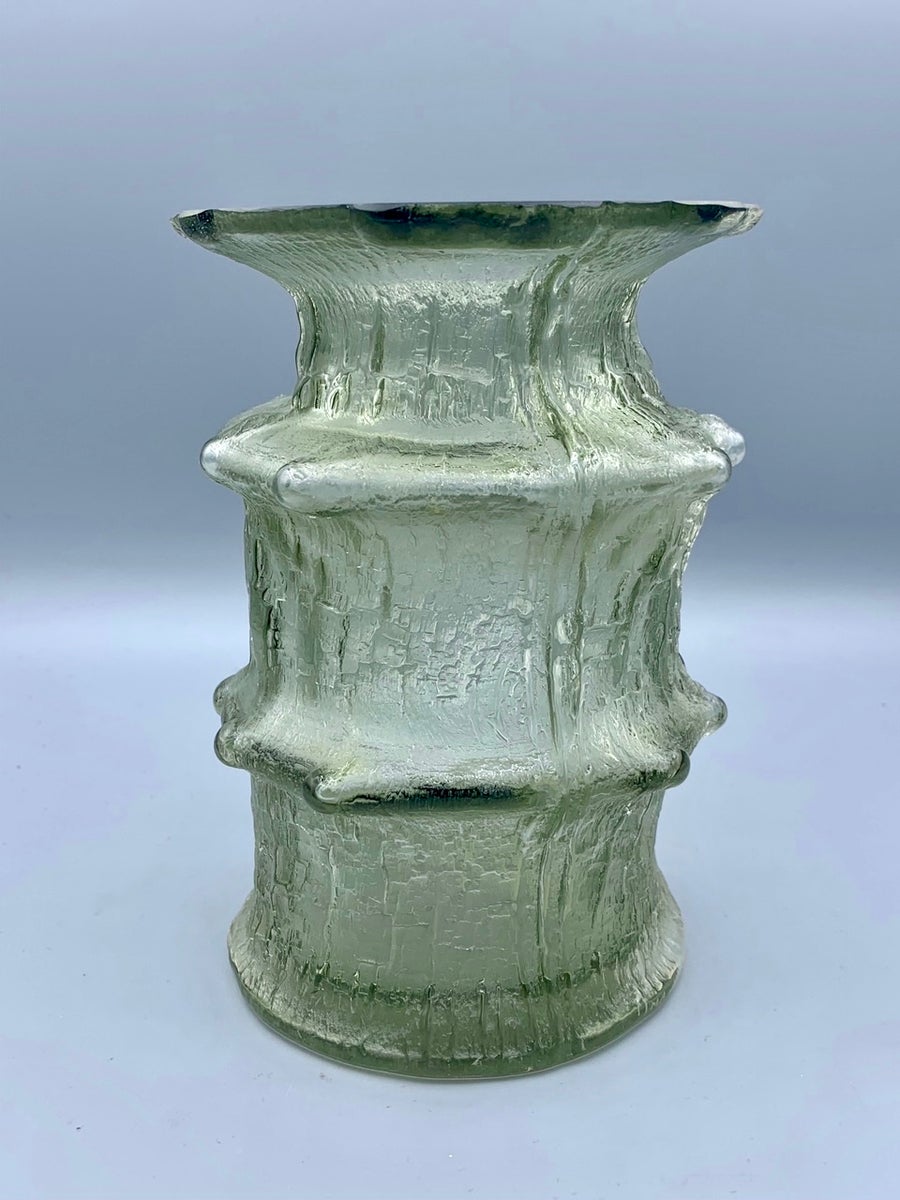 Puumuottiin puhallettu, vihreän ja harmaan sävyistä lasia.